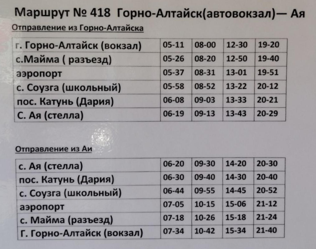 №418 - г.Горно-Алтайск (Госуниверситет) - с.Ая (Хвощевка)